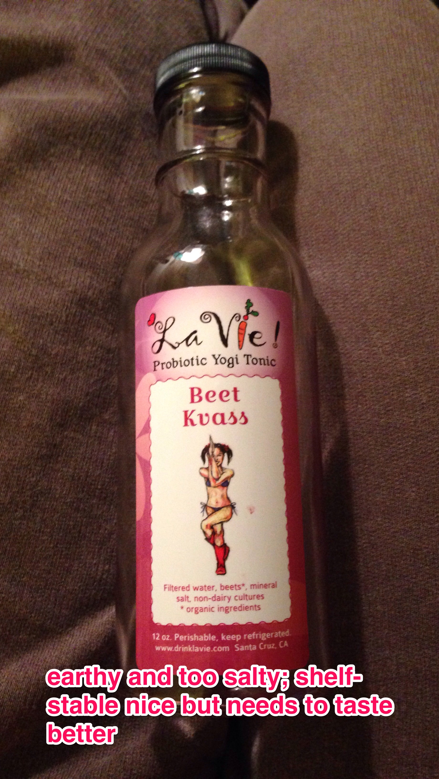 Purchased a bottle of La Vie Beet Kvass Probiotic Tonic at the Alameda Webster Street Farmers’ Market 2015 March 14 for $5. We found the taste too earthy and salty; the expected slightly sweet beet notes were missing. We did appreciate that the beverage is shelf-stable until opened.